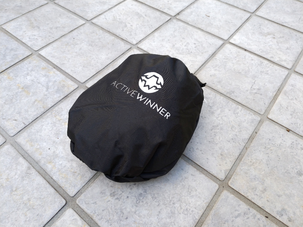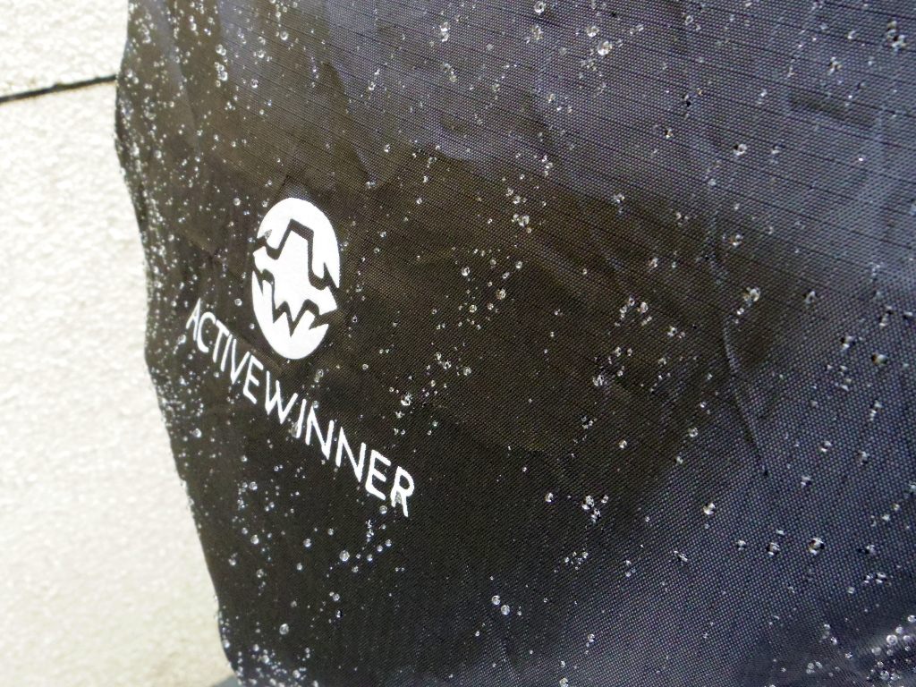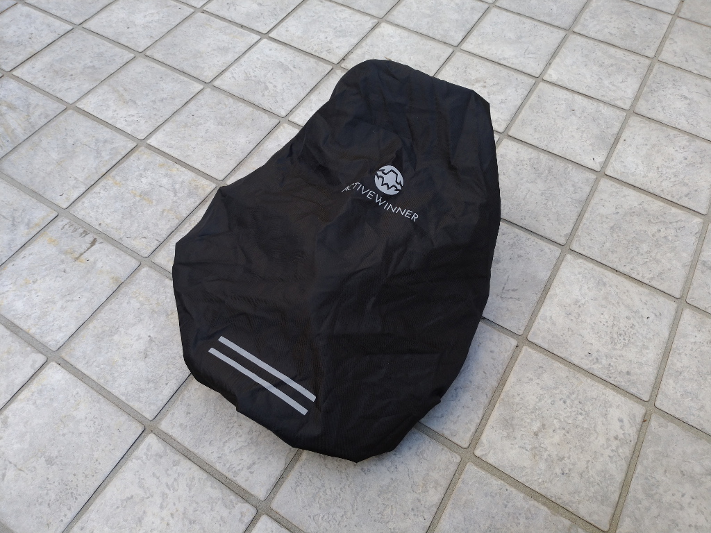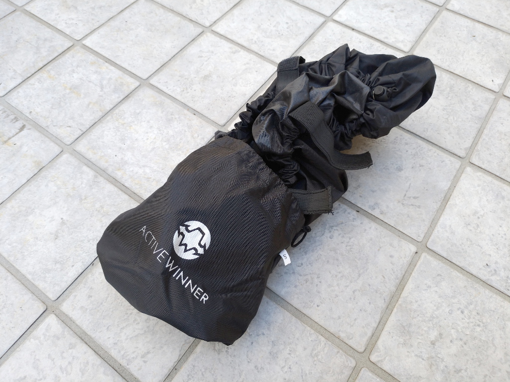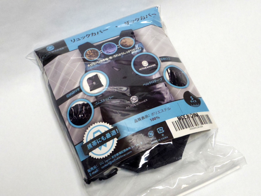 今までは、100円ショップなどのママチャリ用、カゴカバーなどを使っていたのですがやはり「チャチ」ですぐに穴が開くことと、防水性能が低く、浸水を防ぎきれない状況でした。そこで、冒頭の考えのもと、「登山用リュックカバー」を入手しようと考え、以前自転車カバーなどで、その商品に信頼を寄せていた Active Winner ブランドのリュックカバーを入手してみました。サイズは S と M がありましたが、対象のバッグの大きさを考え、 Sサイズにしました。