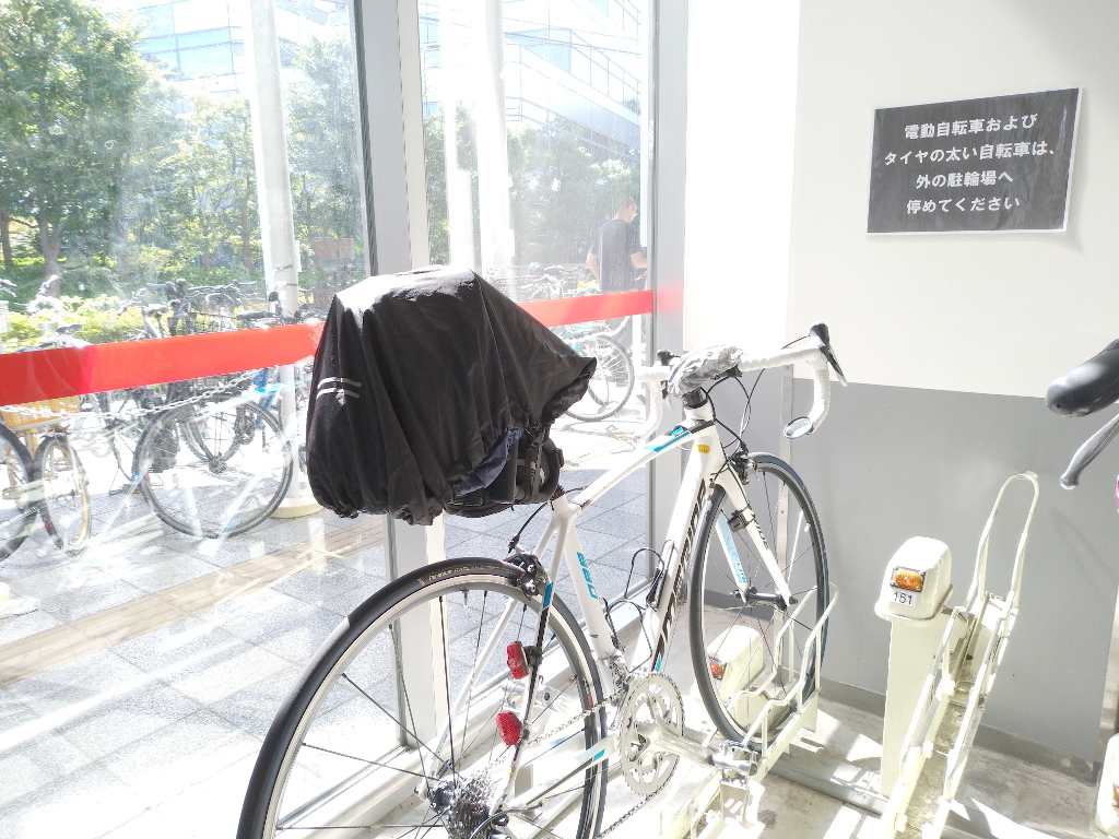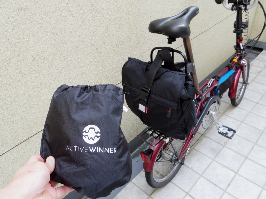 このままだと、何となく不用心であるため、長時間駐輪する場合は、コンビニのビニール袋などをこのヘルメットとサドル、ヴァリオラックに被せておいたりしているのですが、今回、この「Active Winner バックパック レインカバー」をヴァリオラック、サドル、ヘルメット一式のカバーに使うことにしました。