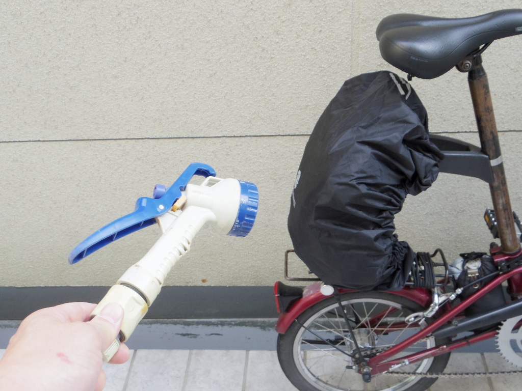 水を止めると、水滴があっという間に下に零れ落ち、細かな水玉が残るだけになりました。笑っちゃうくらい水を弾きます。このカバー。