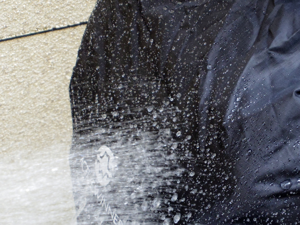 この撥水性の見事さは、水を掛けている状況で良く見ることができます。以下の写真を見ると、瞬時に水を弾いていることが良く分かると思います。