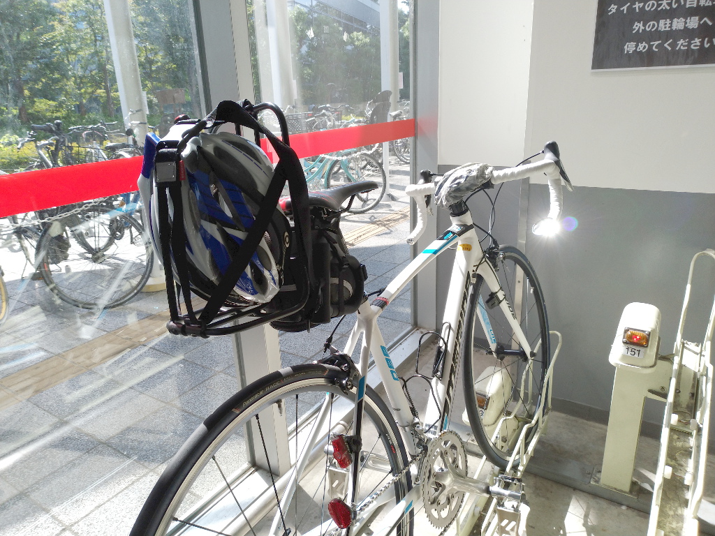 私、リクセンカウルのヴァリオラックをロードバイクの荷物積載にも使っています。その場合、到着時にはこのようにバッグを外したバリオラックにヘルメットを入れて駐輪しています。