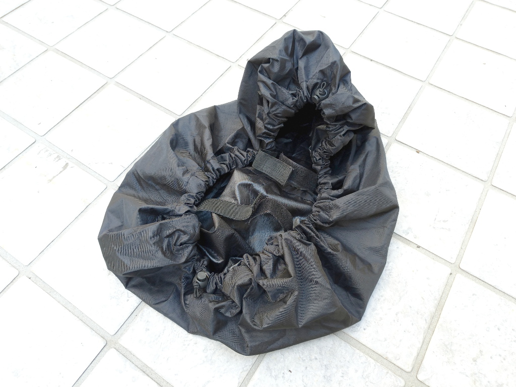 さて、入手したこちらのリュックカバーを車載バッグに被せてみましょう。