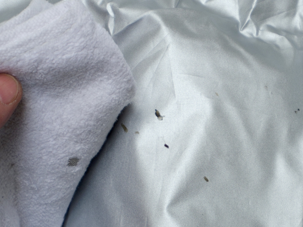 すると、何もなかったようにすっきりとチェーンオイルが取れました!恐らく素材に施されたコーティングの効果だと思います。これならば、屋外で利用し続けても長期にわたって自転車のみならず、カバー自体の汚れも防いでくれるものと思います。