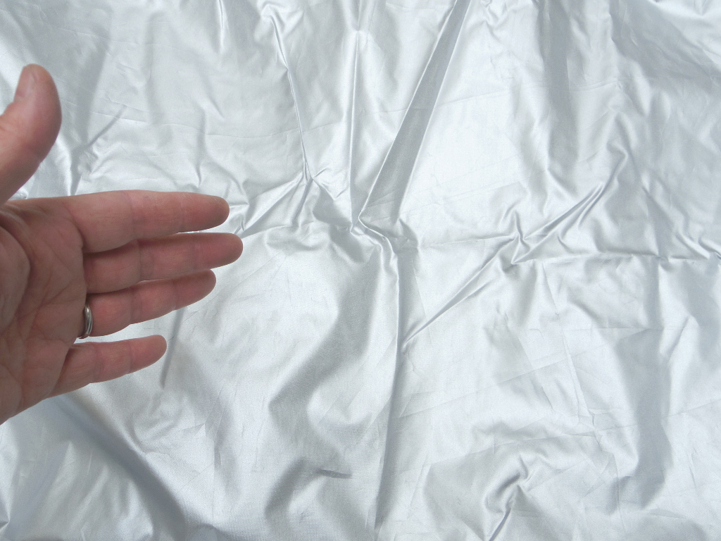 本体を広げてみます。本体は銀色で、上部素材は黒をあしらったツートンカラーです。素材を手で触った感触は「しなやか」。ざらついたりごわごわしていません(ナイロン製)。この素材であれば何度も畳んだりしても折り目が裂けたり弱くなったりしないでしょう。まちがっても「100均」のビニール袋素材カバーと同じではなく、確実に一線を画しています(比べる対象でもないか…)。