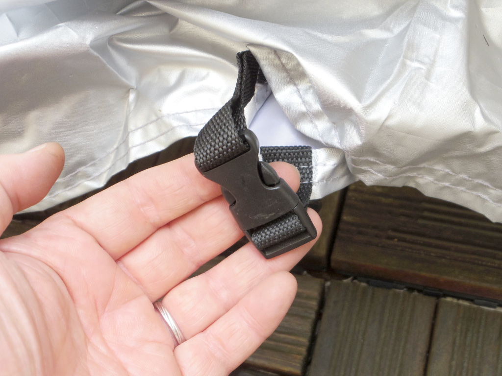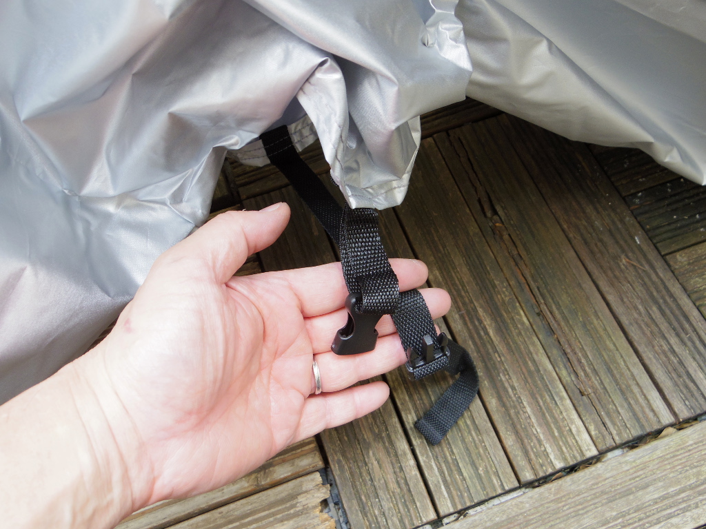 カバー下部には、樹脂製の結束用バックルが付いています。これは屋外保管の際に大事なことで、ただ被せるだけだと風が強いときにカバーがあおられて飛んで行ってしまいます。それを防ぐためにはカバー下部を結束することですが、単なる「紐」だと面倒なので結束がおろそかになりがちです。