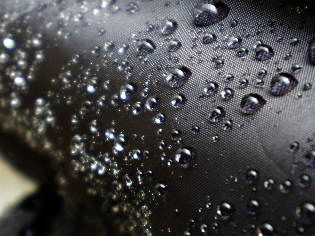 素材全体に撥水加工がされています。降り注いだ水は水滴になって下にコロコロと落ちていきます。このように水滴の形状が「球状」に近い(接触角が大きい)のは、撥水性能が極めて高いことを意味します。