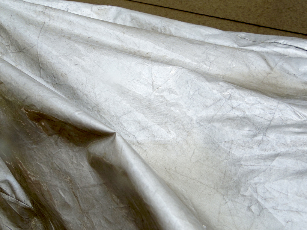 参考のため、標準タイプの自転車カバーと比較してみます。このカバーはすでに利用している中古品なので、正当に比較できるものではないことを申し添えておきます。