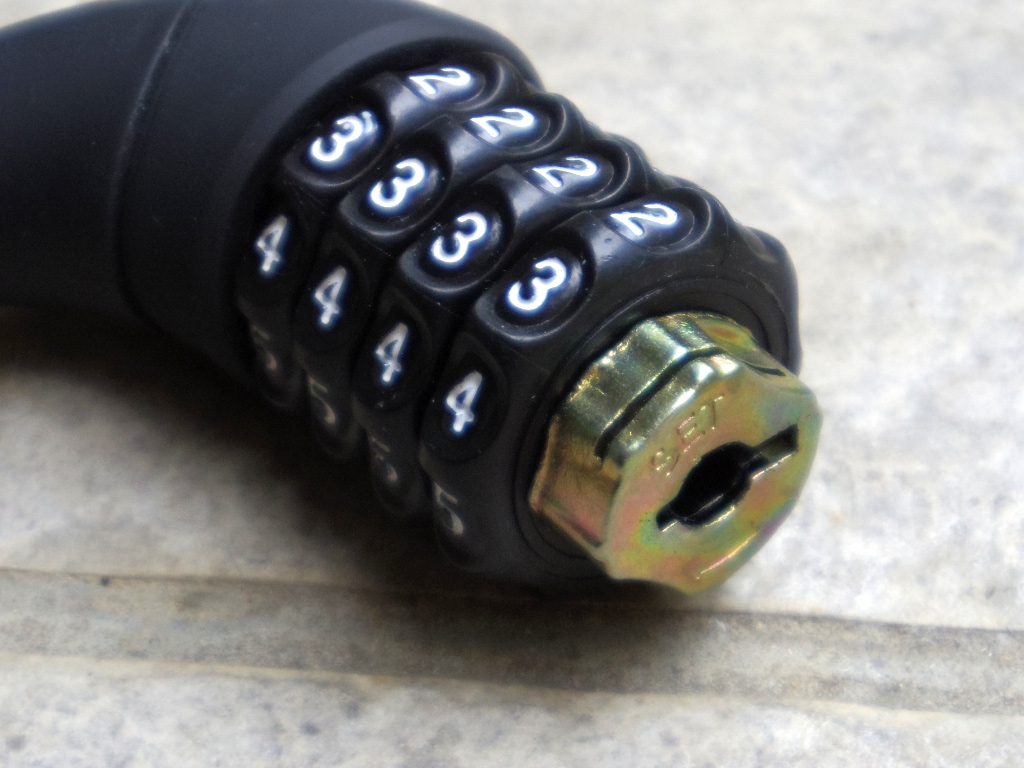 また、鍵の要らないダイヤル式というのも良い点です。私の持っていたロックA(購入時添付品)は開錠番号が「固定式」であったため、聞きなれない4桁の番号を暗記する必要がありました。その点、この ACTIVE WINNER では、ロック解除の状況で、このシリンダー部をセット方向に回すことで自分の好みの4桁番号に開錠番号をセットすることができます。