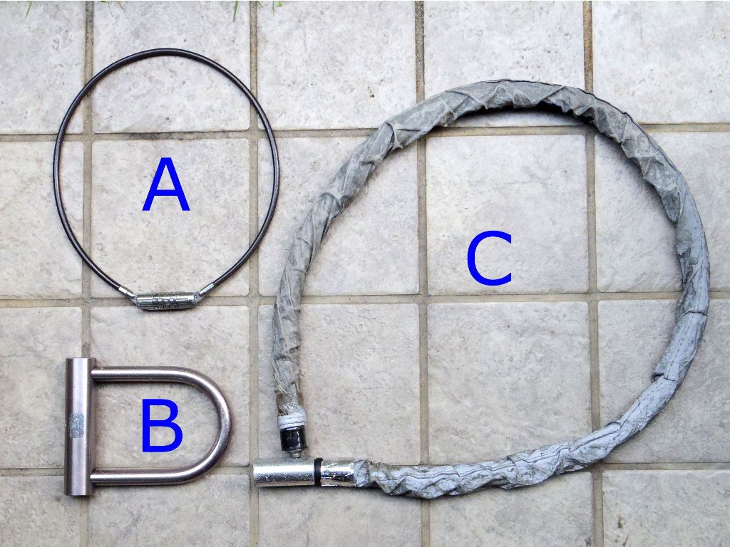 このロックといえども、本当のプロの手にかかれば破られてしまいます。プロの餌食になりやすい状況、例えば、毎日定位置駐輪する場合とか、長時間(10時間以上)人目の触れない場所に停めなければならない場合などは、私はロックB(U字ロック)とロックC(キーシリンダー型ロングワイヤーロック)を併用します。