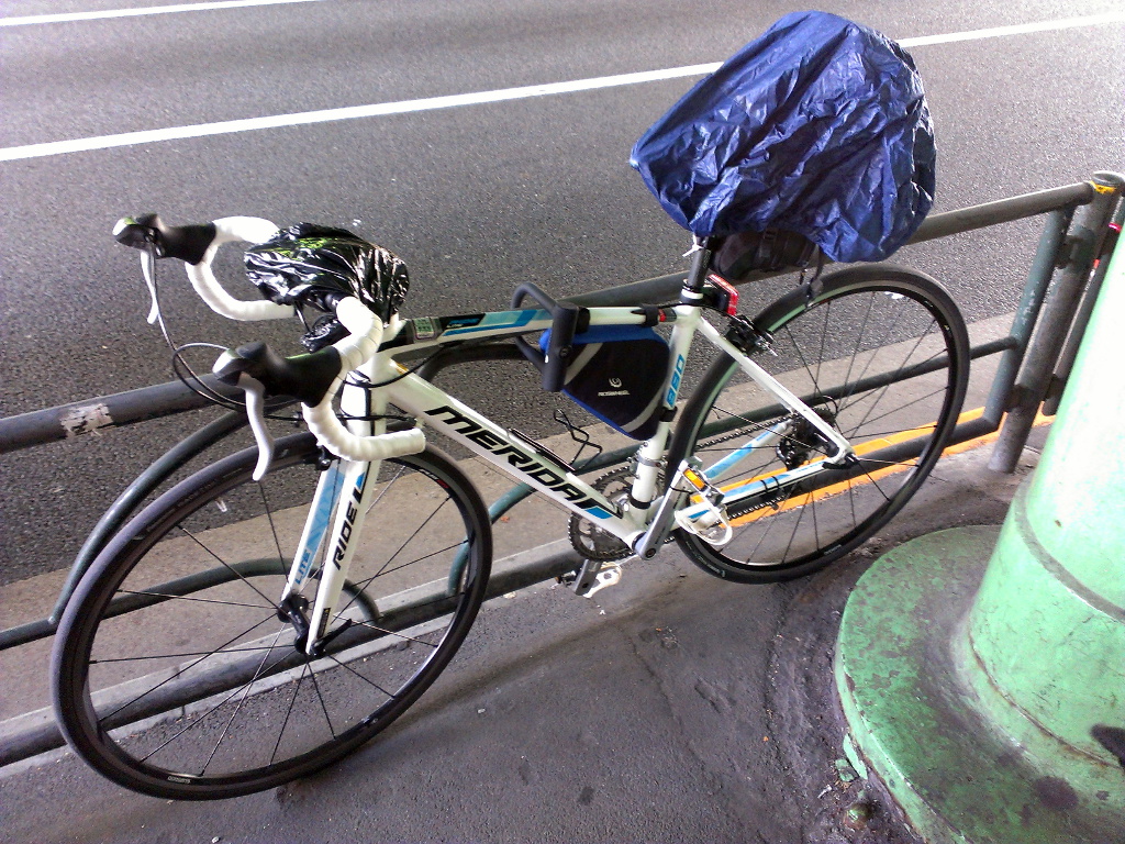 U字ロックは、車輪に装着するのではなく、このようにガードレールのパイプなどの強固な地上固定物に括り付けるのが盗難防止上望ましいです(いわゆる地球ロック)。