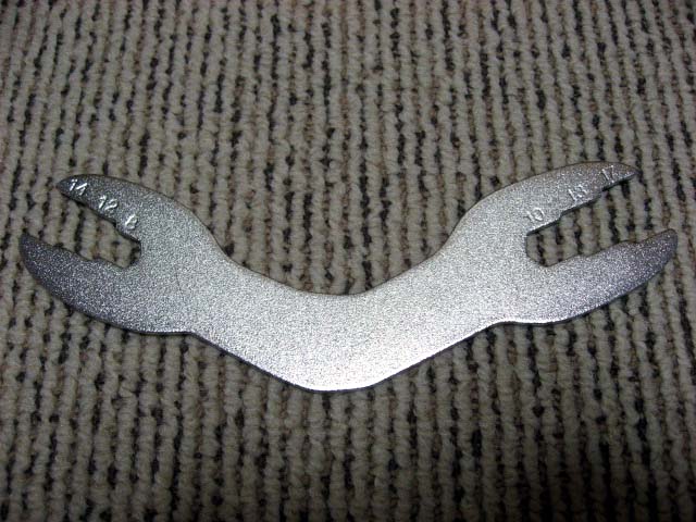 玉押しを取り付け、ベアリングがスムーズに動き、なおかつガタがない位置でロックナットを使って締めつけます。その際に、玉押しが締めこまれて行かないように、薄型のハブコーンレンチが必要ですが、今回は先日買ったダイソーの薄型レンチが活躍しました。