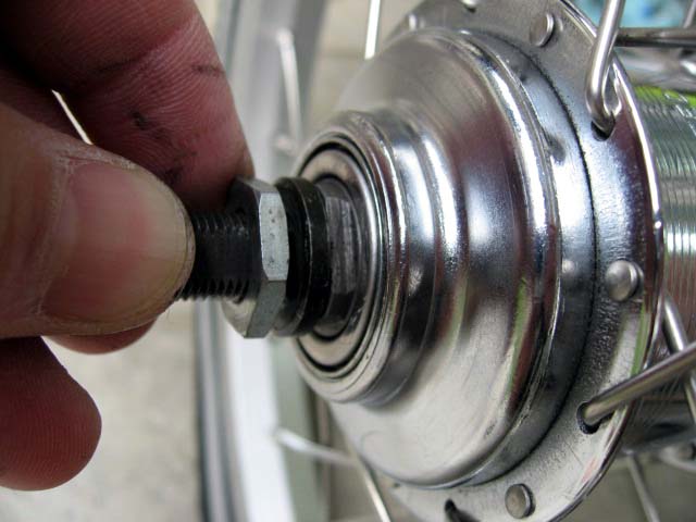 車軸の左右にベアリングの玉押し(corn)を固定するロックナットがありますので、これを緩めて外します。