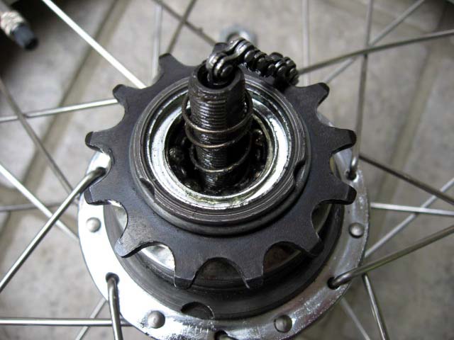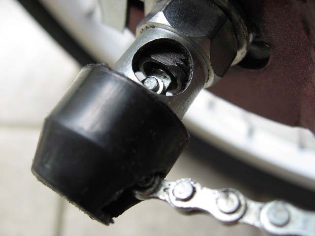 この状態で注意すべきことは、変速用のチェーン(ギア・インジケーター・アクスル)は、内部でアクスル・キーという小さいピンに数回転のレベルでねじ込まれていて、うっかりするとすぐ取れてしまいます。取れた状態ではアクスル・キーが内部で脱落しやすいので、変速用のチェーンは常に付けておくように気を付けなければいけません。