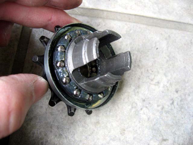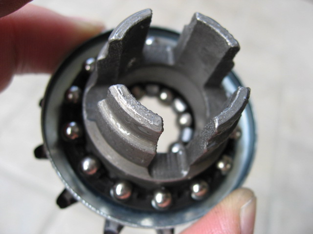 こちらは、スプロケットが直結しているドライバーです。この4本付き出たアームがペダリングの力を変速機に伝える役割を果たしています。部品としては大きな強度が要求される所です。内部の部品はほとんどが焼き入れされた炭素鋼でできた強固な材質で、言わば自動車のトランスミッションレベルの部品の材質でできています。壊れにくいというのもうなずけます。