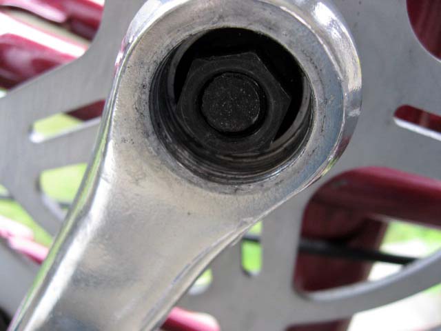 このカバーを取り外すと、クランクを軸の内側へと固定しているナットが見えます。