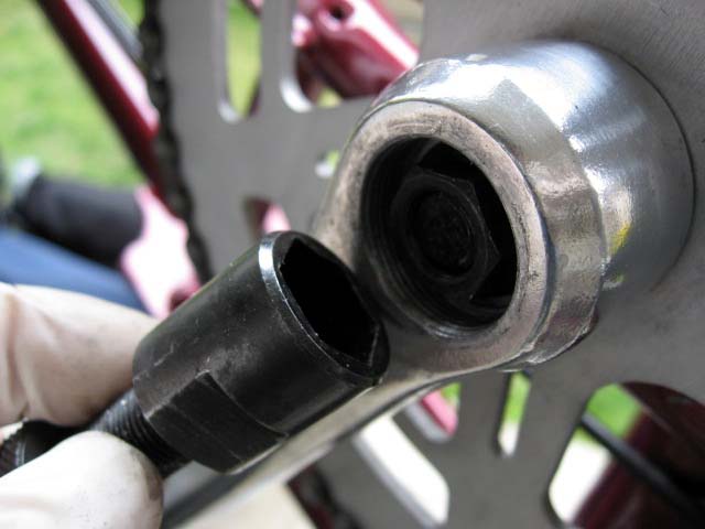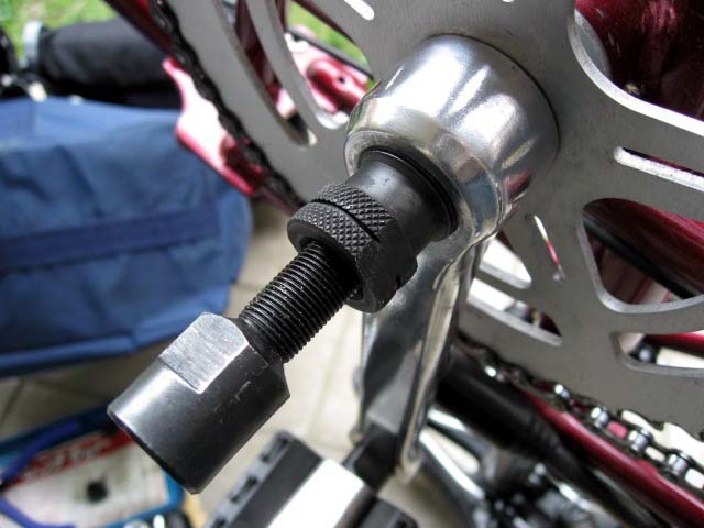 ナットを外しただけではクランクは外れません。強力な力で四角形のテーパーに食い込んでいるからです。そこで、 TL-FC10 の反対側をクランクの軸受け穴にねじ込みます。その前に TC-FC10 自体を反時計回りに回し、本体を伸ばしておく必要があります。