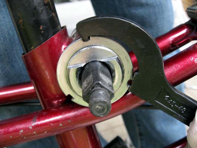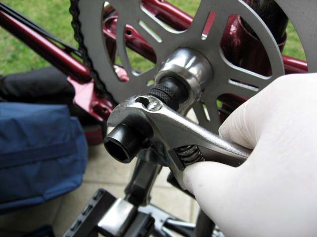 このフックレンチを使って、ロックナットを緩めます。こんな感じで利用します。このロックナットは、自転車のクランクギアではない側(左側)に存在します。その場合は緩める方向は「反時計回り」です。下の写真は、「締める」方向なので注意。