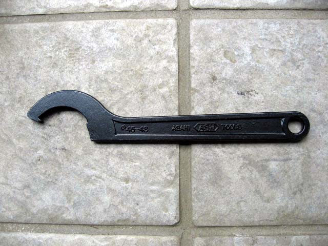 BBの玉押し部は、切り欠きの付いたロックナットで固定されています(上の写真の右上部分)。分解するためには、この工具が必要になります。「フックレンチ」です。