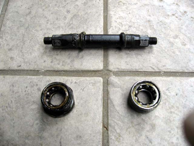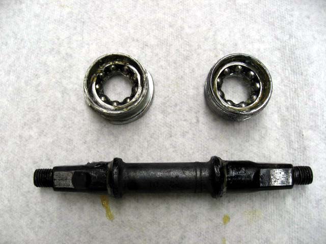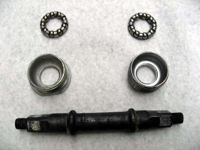 あとは、構成部品を左右間違えずにBBに挿入し、玉押しを固定して軸の回転具合を調整します。シャフトには左右がありますので注意が必要です。シャフトにはボールベアリングを受ける「山」が軸上にありますが、その山から先端までが「長い方」にギア付きのクランクが入ります。つまり長いほうが右側になるようにして挿入します。
