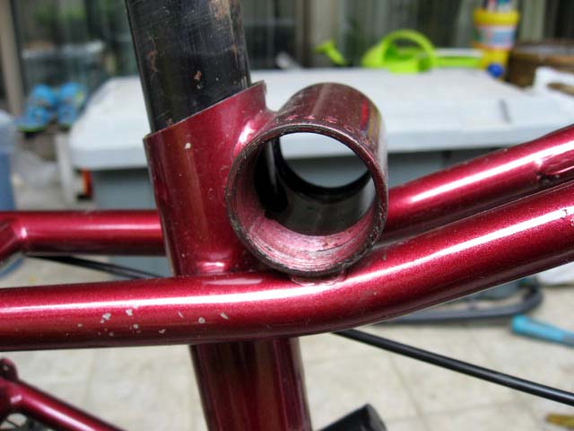 取れました。BBの中はネジ山が切ってあるだけで、こんな「中空」です。この機会に、BBの内部をきれいに掃除しておきましょう。