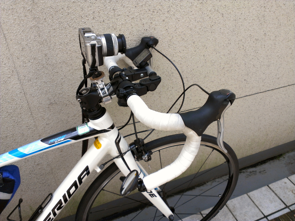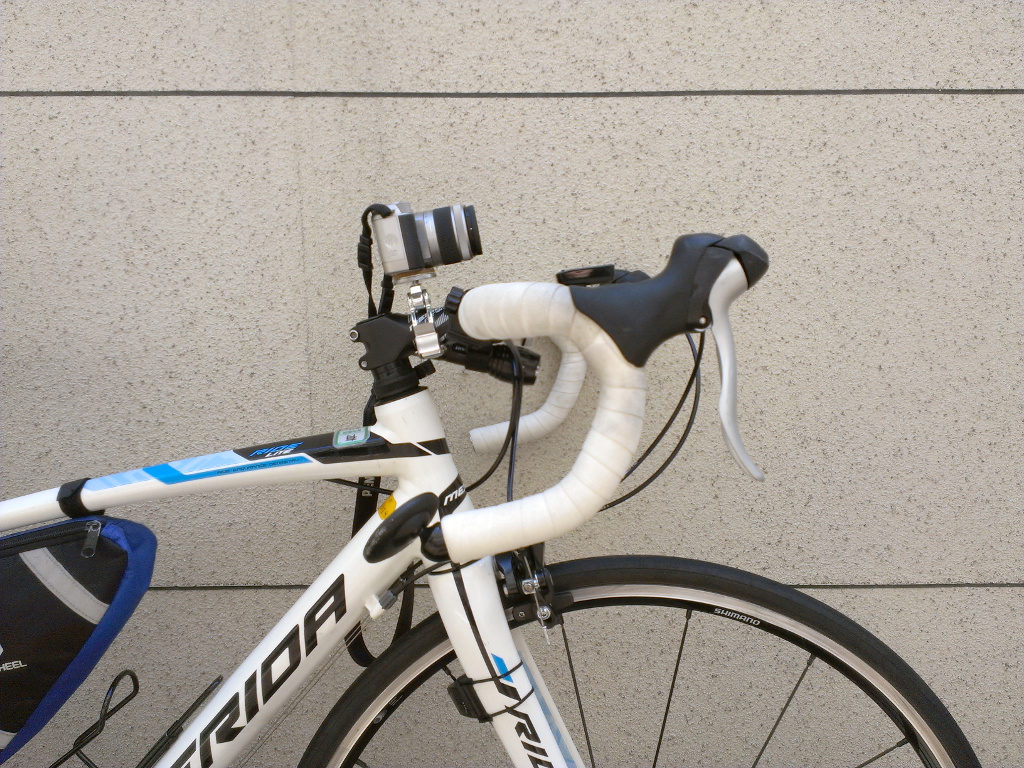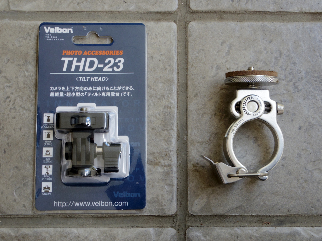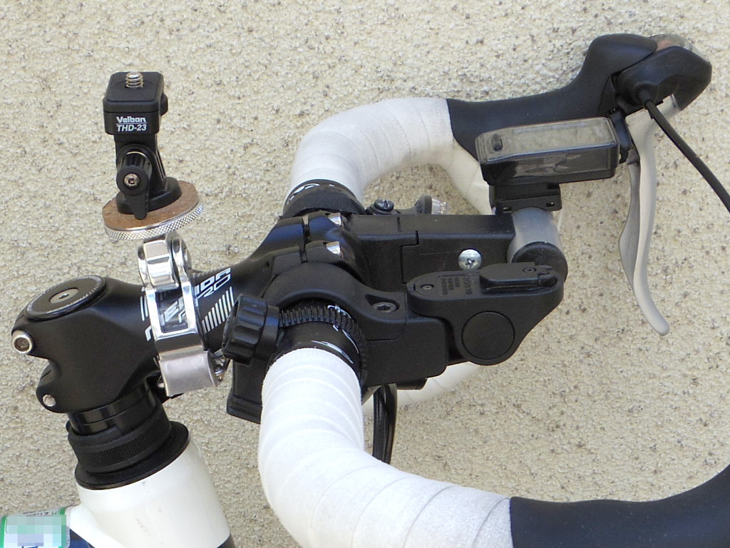 ロードバイクのステムにカメラをマウントするため、Minoura VC-100M と Velbon THD-23 をセットで利用してみました。 |