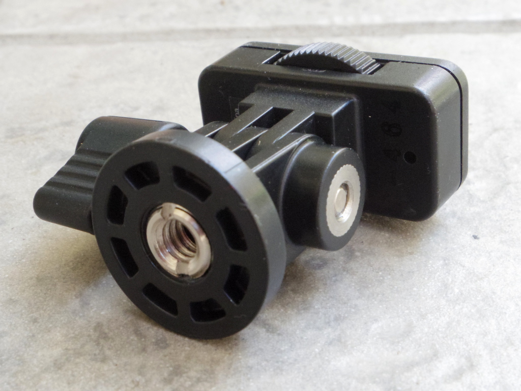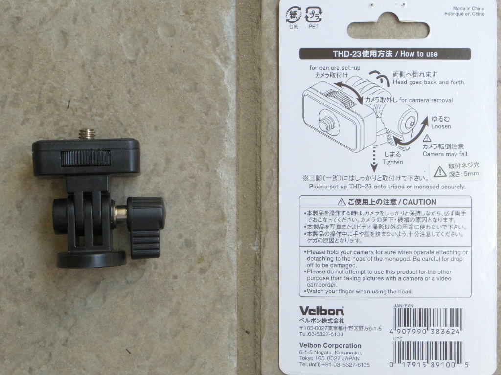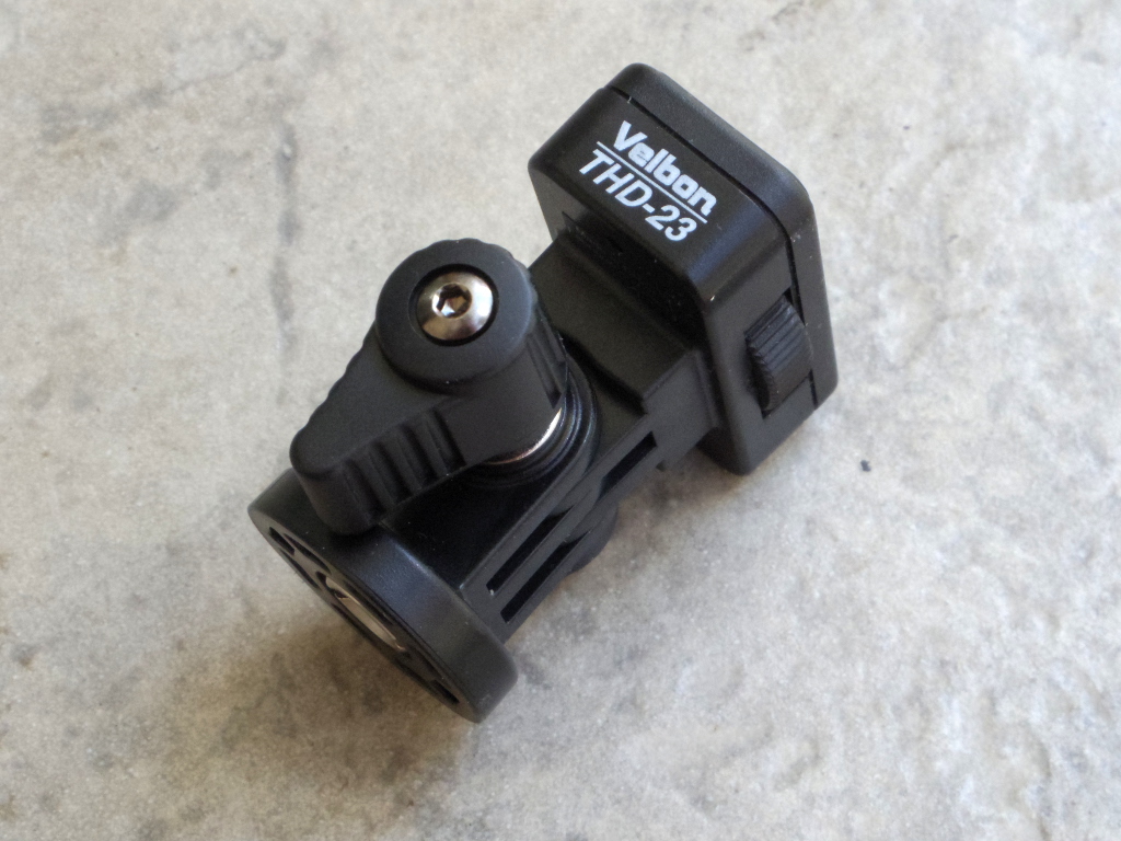 この状態でも前方の景色が映らなくはないですが、経験的にはカメラが水平の方が違和感のない映像が撮影できるので、このままだとまずいです。そこで、もうひとひねりします。マウント剛性が多少低下するのは覚悟の上で、Velbon のチルトヘッド「THD-23」を追加することにしました。