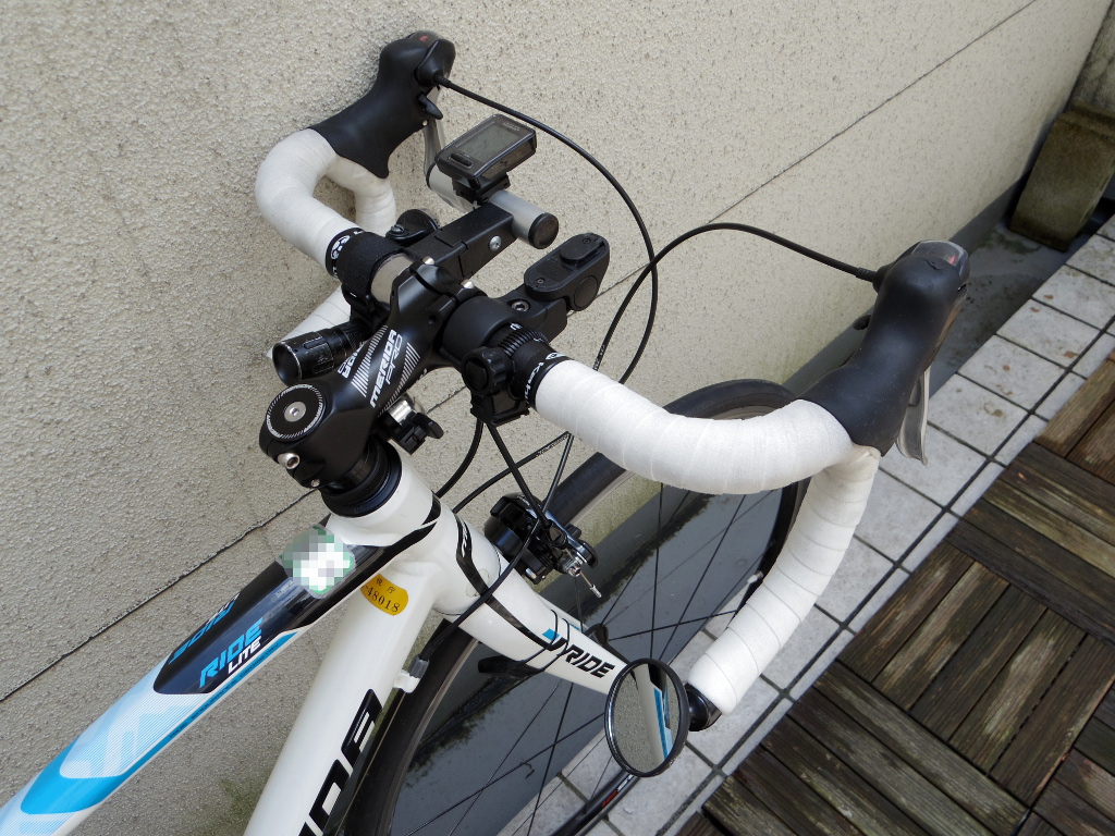 ステムマウントをトライした理由は「速度計を同時に写せるかも」という期待です。現状、私のロードバイクのハンドルは、ロードバイクらしからぬほど、色々なものが取り付けられています。