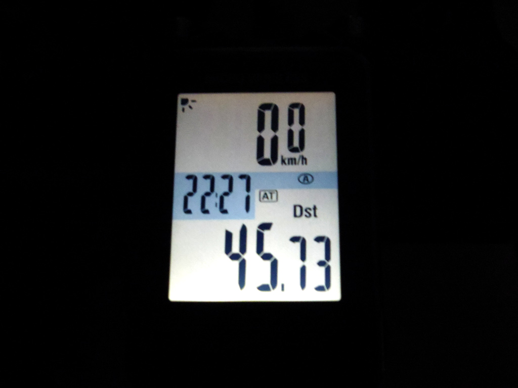 という両方の原因で、液晶表示が薄くなって見える角度になってしまった状況だとわかりました。ちなみに、次の写真は撮影するポイントを後ろにしてみた状況。液晶表示がくっきりしていることがわかります。しかし、この角度でサイクルコンピューターを見ることは、私のライディング・ポジションでは不可能です。