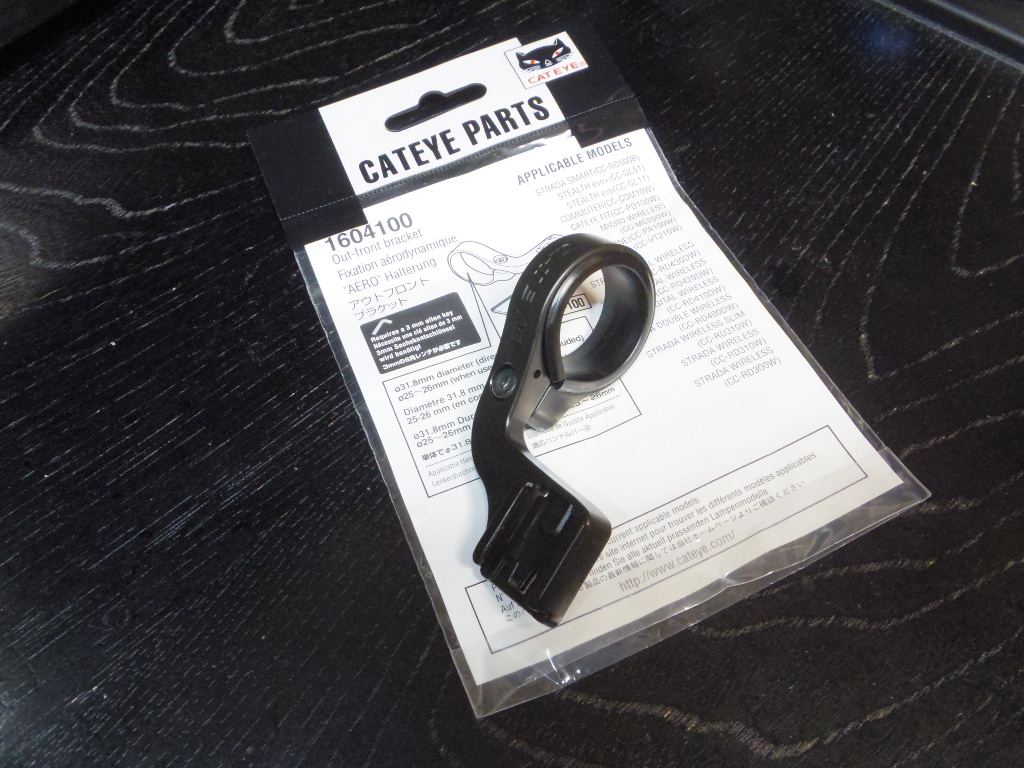 そこで、その解決策として「CAT EYE アウトフロントブラケット」を購入しました。このブラケットは対応するサイクルコンピューター専用のブラケットで、ステム右横のハンドルバーにマウントすることで、サイクルコンピューターをステム前方に装着することができるマウントです。値段も1,000円ちょっとと手ごろです。