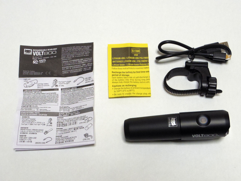 CATEYE VOLT800(HL-EL471RC)は、数ある CATEYE のヘッドライトの中で、最上位クラスに位置するものです。値段も1万円以上と半端ありません。私は VOLT300(HL-EL460RC)を持っていますが、だいぶ(3年以上)使い続け、最近はバッテリーの持ちがだいぶ悪くなりました。バッテリーを買い足しても良かったのですが、せっかくの機会なのでいっそのこと最高レベルのライトを買ってしまおうと考え、VOLT800を買いました。バッテリーはVOLT300と共通利用ができるのも決断した理由です。