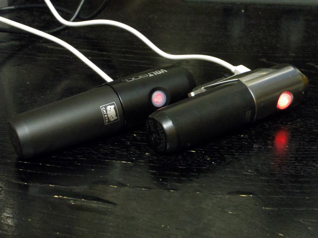 充電は micro USB ケーブルで行います。充電中は操作スイッチ内に埋め込まれた赤い LED ライトが点灯または点滅します。そのLEDライトの明るさは、なぜか VOLT 300 よりも控えめになりました。この LED ライトは点灯時にローバッテリー状態を知らせる役割も兼ねており、その意味で消費電力の低いLED素子に変更になったのかもしれません。