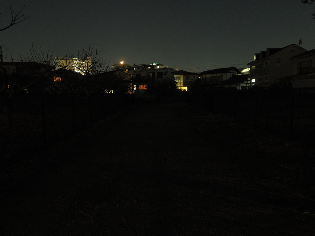 恒例の定点観測地で、明るさを比較してみます。場所は都内某所。近隣で街灯もない真っ暗な場所はなかなかないですが、ここは畑の中の一本道。夜は相当暗い場所です。