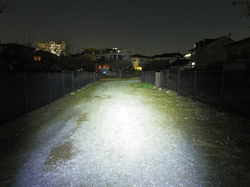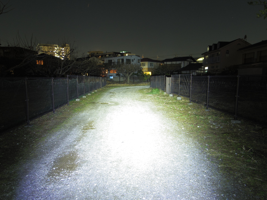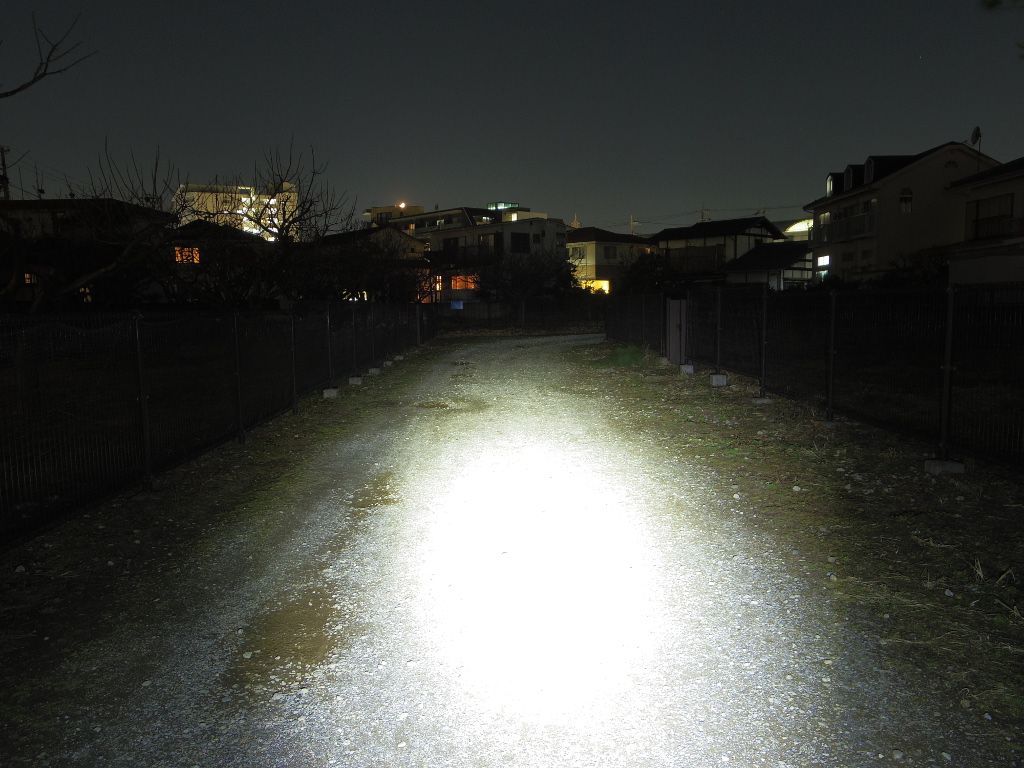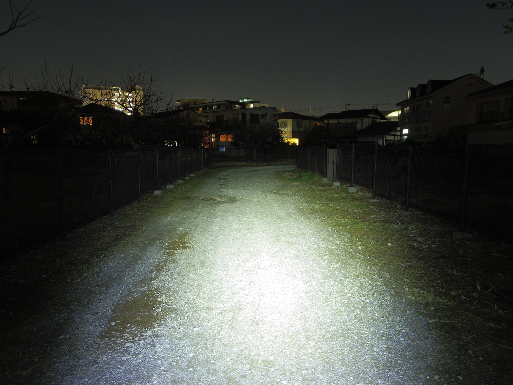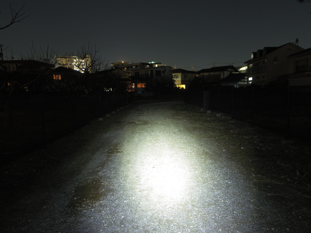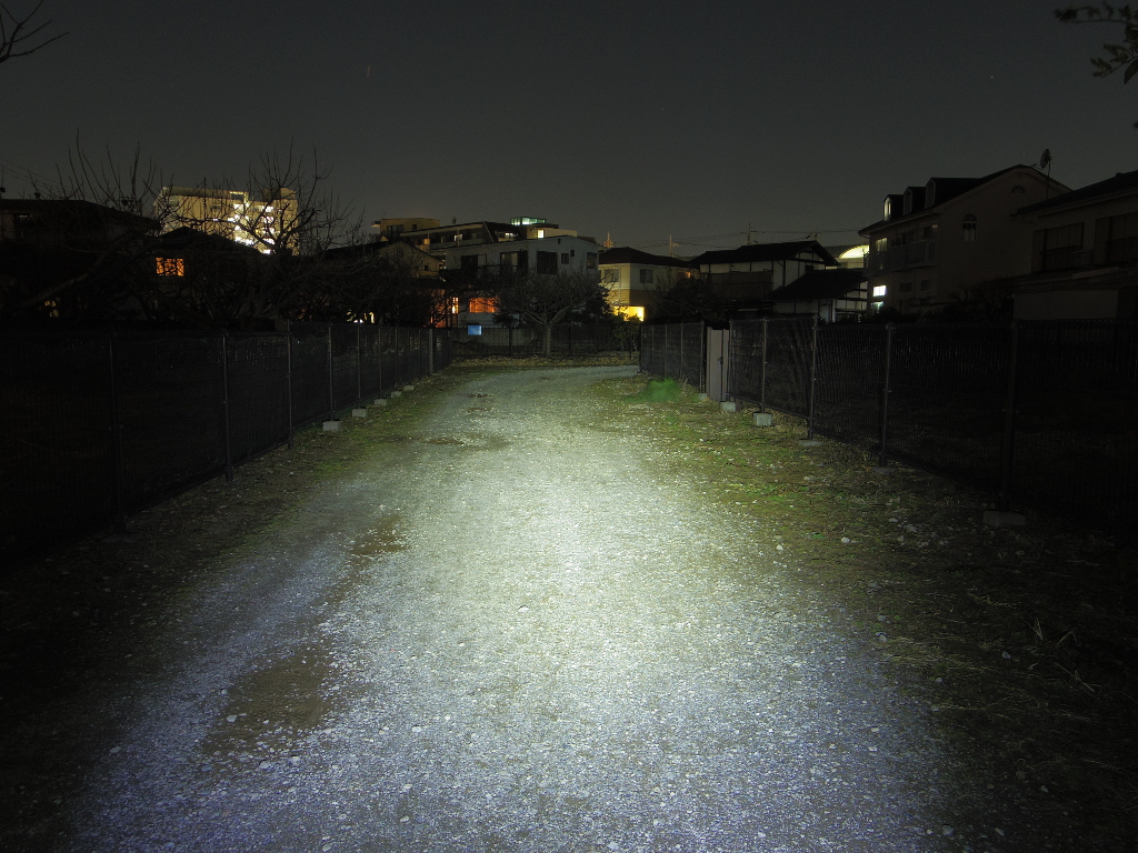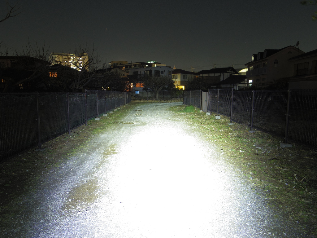 次の写真は VOLT800 の光軸を少し上に向けて、約8m先を照らすようにしたもの、この光軸だと対向車や前方の歩行者から見ると相当まぶしいので、このセッティングは交通量の少ない郊外の道を高速で走る場合を想定したものです。