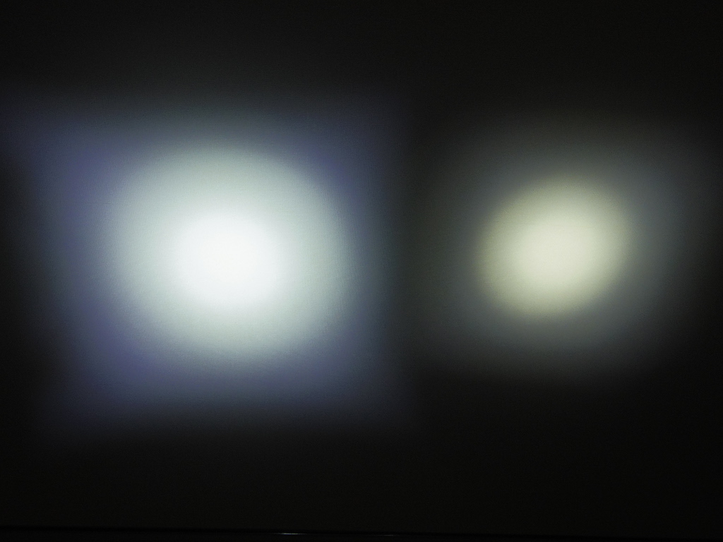 この VOLT 800、その光量の増加を主として照らす範囲を広げることに使っています。次の写真は、VOLT800(左)とVOLT300(右)の配光の様子です。約1mの距離から白色の壁面に照射したときの光点を撮影したものです。