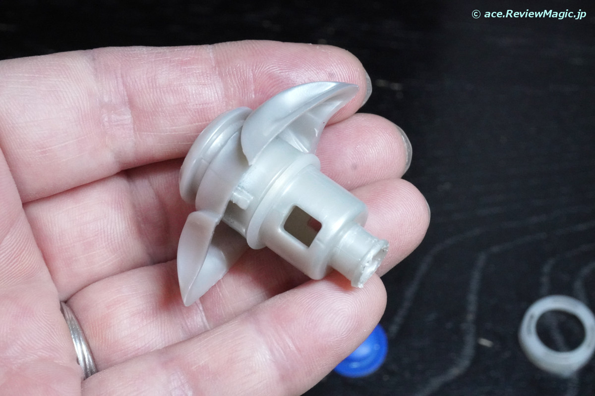 組付けは、分解よりもかなり気楽で、パチンパチンとはめ込んでゆくだけです。しかし、組み付けの際、重要なポイントがあります。Oリング(パッキン)の装着を忘れないことと、弁の向きです。このように、弁の凸部は容器の内部に向くようにします。逆にすると内部の補給水が漏れ出てしまいます。