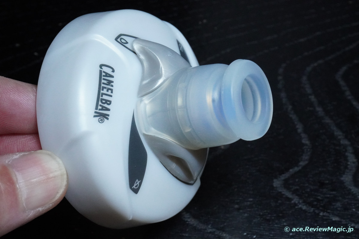 このボトルは飲み口に工夫があり、内蔵弁による不用意な補給水の流出を防ぐ仕組みと、飲み口を完全に閉じるボトルロック機構が施されています。