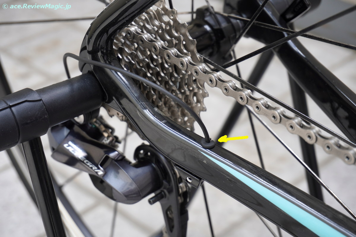 Di2 のケーブルをフレーム外に引き出す部分に取り付けるグロメットを標準添付品からシマノ製品に取り換えました。 |
