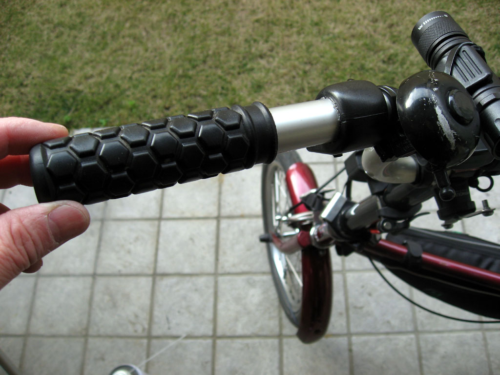 しかし、長年使い続けていると、さすがに色々なところでガタが来て、細かいパーツは取り換えたり修理したりしています。今回はハンドルのグリップが劣化で膨張してしまったのか、スカスカになってしまいました。
