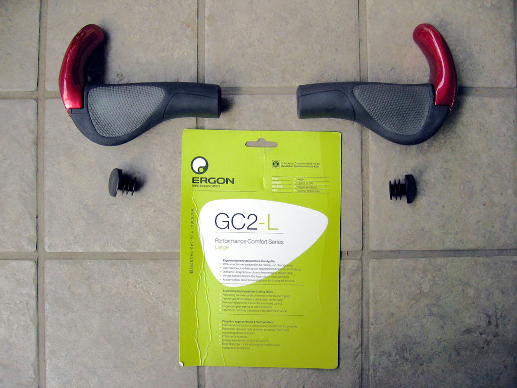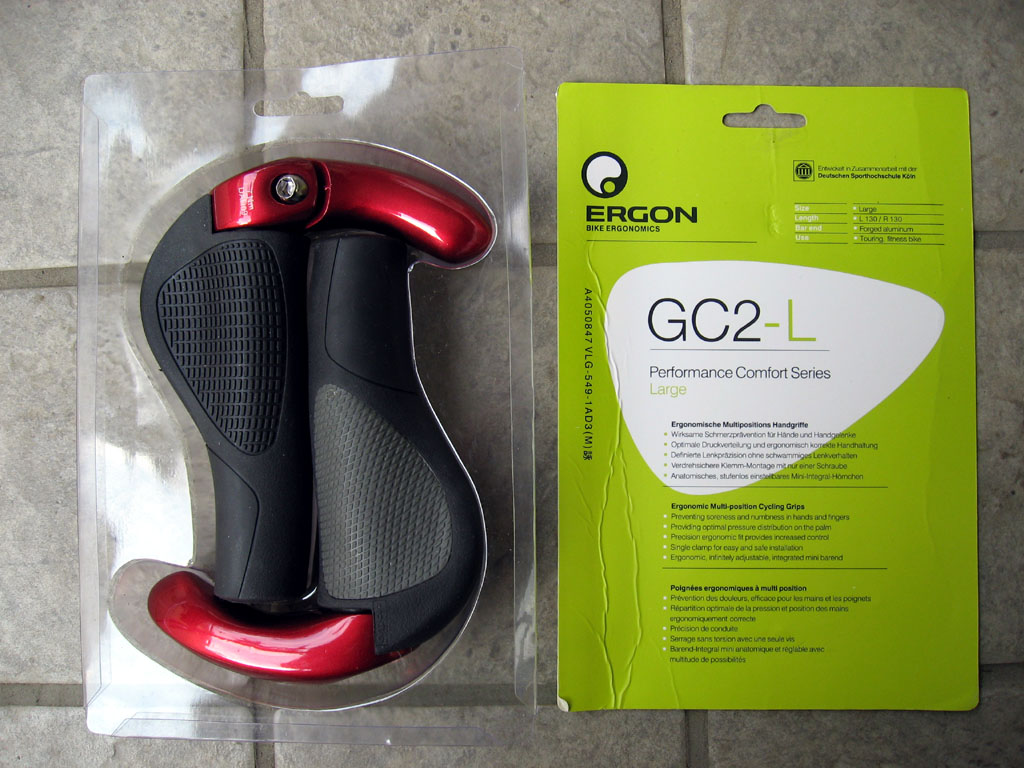 バーエンドとは、ハンドルバーの末端にくくりつけて、乗車姿勢に変化を付けて、長時間乗車時の疲労を軽減するものです。この自転車で、それほど長距離を走るつもりはありませんが、バーエンドを付けて見たかったので、この際、「バーエンド一体型」のグリップを購入することにしました。エルゴノミックタイプのバーエンド一体型グリップ「ERGON GC-2L」です。