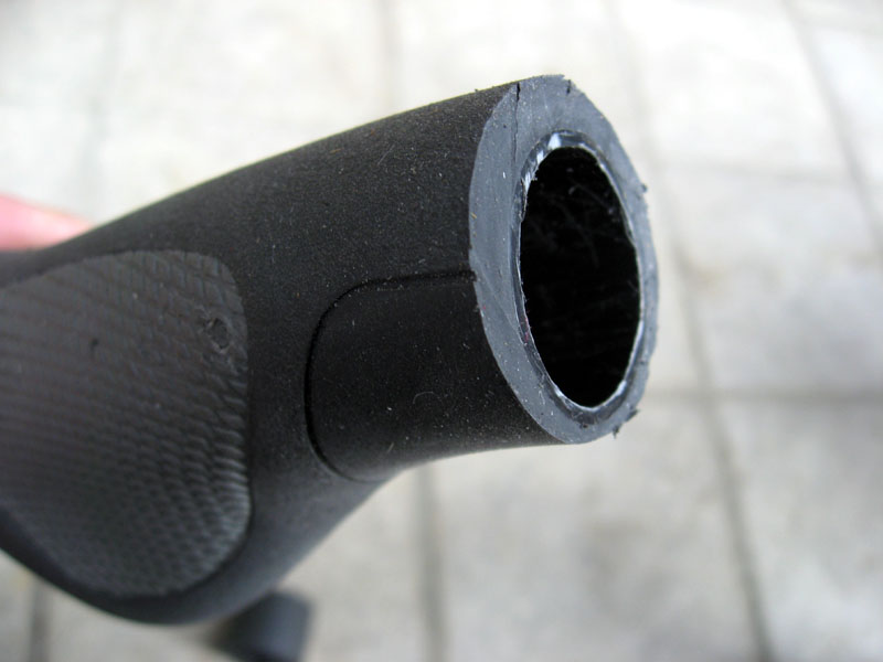 このグリップは単なるゴムの成型物ではなく、ハンドルバーと接触する内側には「芯」がありました。切り取るまではその芯の材質が分からず、「金属や切断しにくいものだったらどうしよう」と不安でしたが、どうやら塩ビのような硬質プラスチックで、カッターで切り落とすことができました。