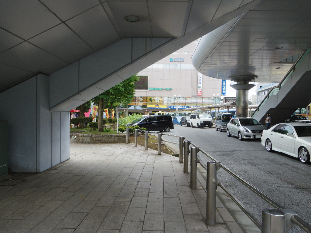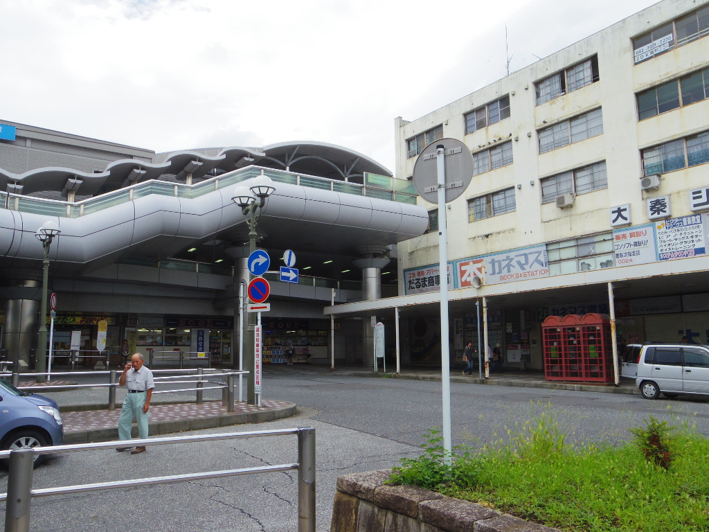 秦野駅に着き、駅を見上げた様子。近代的な駅舎とその横のレトロ感あふれるビルが対極的です。