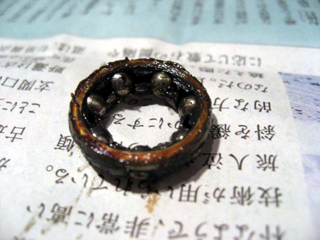 取り外したベアリングです。油切れは起こしていませんでしたが、ホコリと錆びで相当汚れていました。