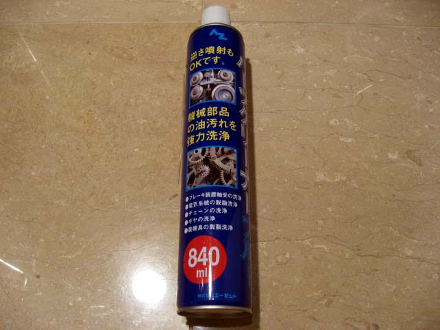 そこで、古い油脂をすっきり落とし、その上でグリスを塗布することになりますが、その際に使うのがこの石油系のクリーナーです。これを使うと、石油が油を溶解し、こびりついた油をきれいに落とすことができます。