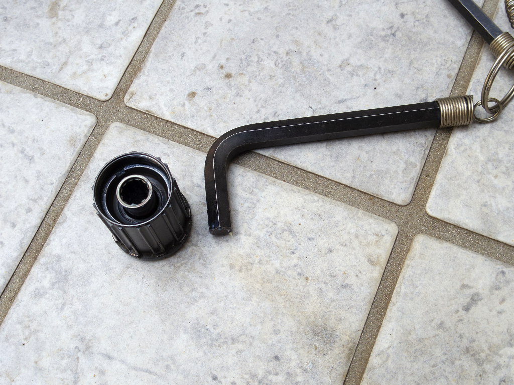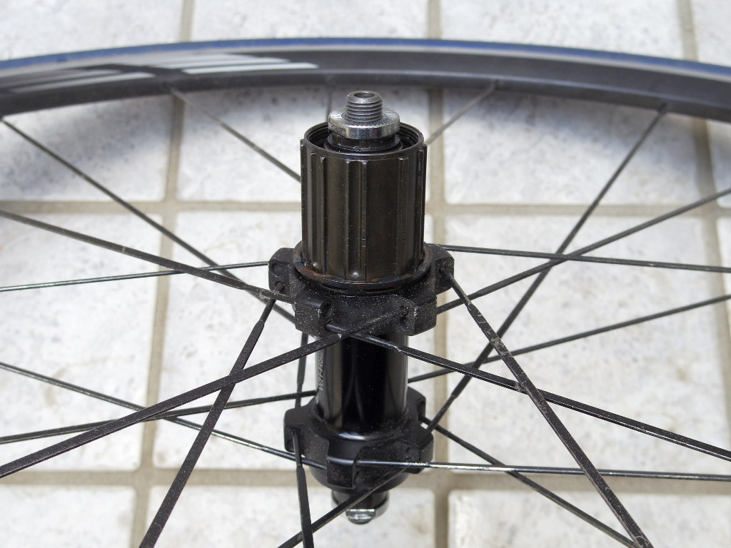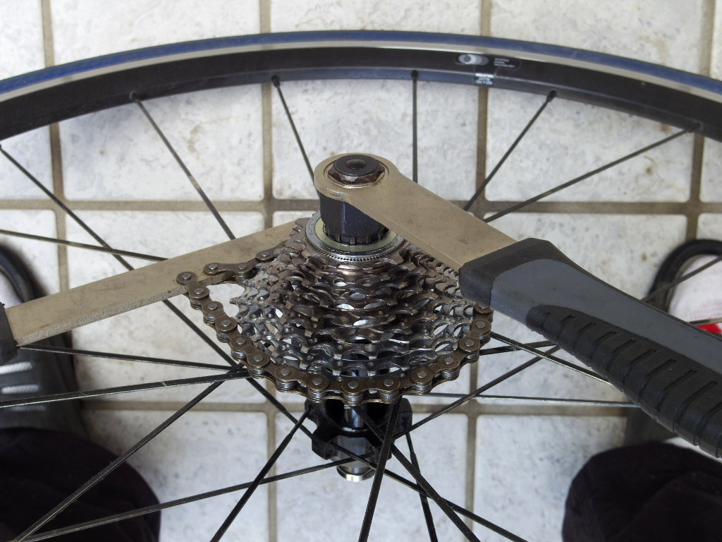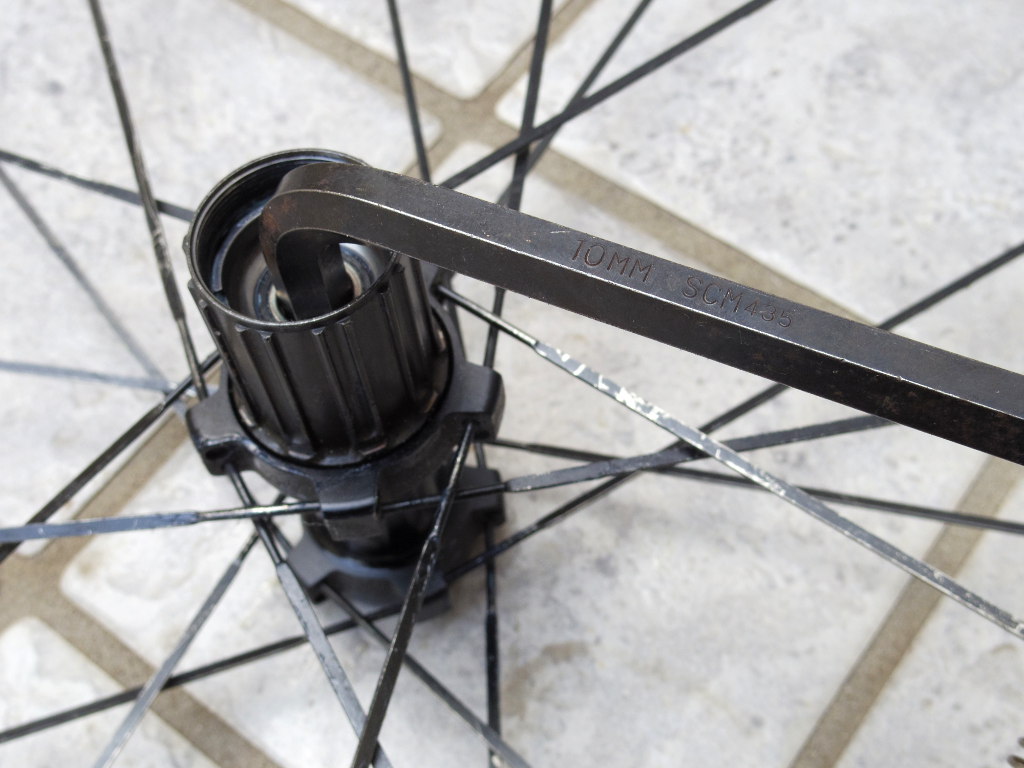 このフリーを外すためのレンチの回転方向は通常ねじと同じく反時計回り。タイヤを立てて、レンチに軽く体重を掛ければ緩みました。この緩んだ時の感触を覚えておいて、取付時に生かします。