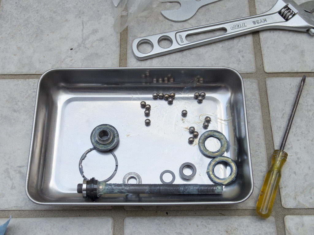 次に、ベアリングボールやボール押さえを取り外してしまいます。ベアリングボールは片側9個。紛失しないようトレーに集約し、合計18個のボールがあることを確認してから次の作業に移ります。