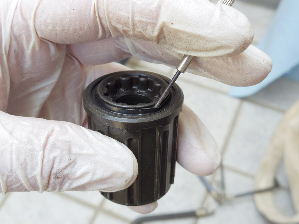 ベアリングボールを外すとフリーユニットが外せます。これを固定しているのは中央のスリーブ。極太の10mmの六角レンチで外します。自転車の整備では、10mmの六角レンチはまず使いません。フリーを外す決意をしたのであれば、10mmの六角レンチがあることを確認しましょう。