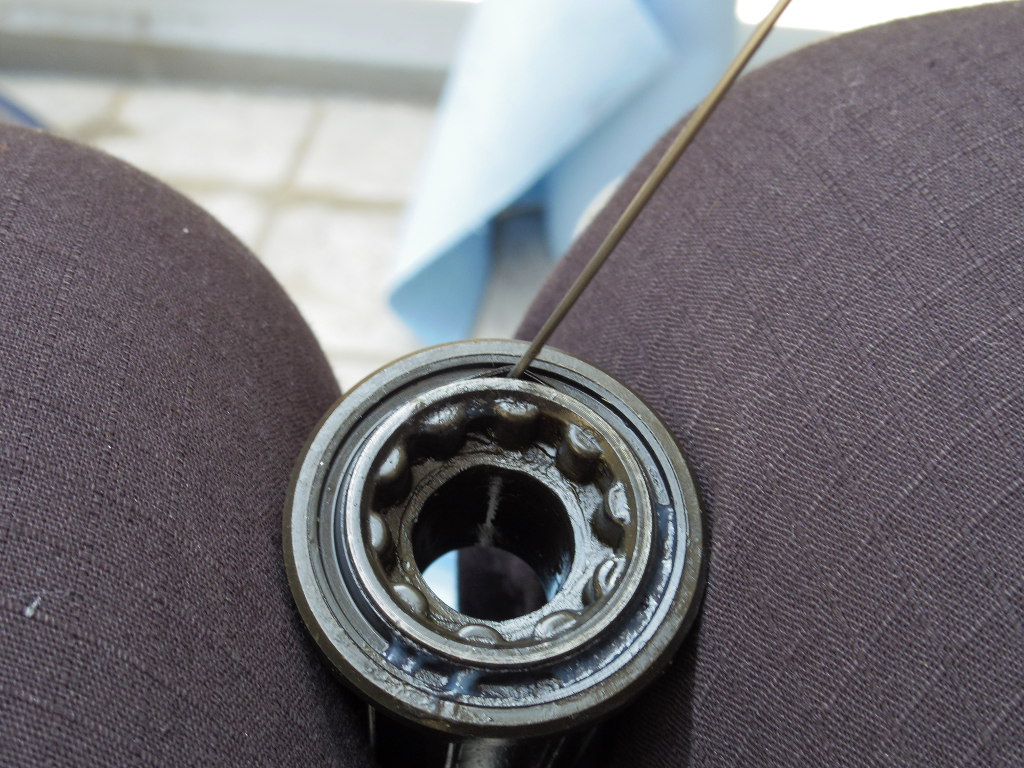ハブシャフトを抜くと、ベアリングボールが見えてきます。このベアリングはリテーナーなどはありませんので、この段階(ハブシャフトを抜いた段階)から脱落や紛失に注意が必要です。