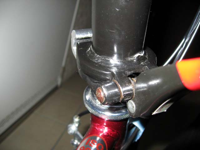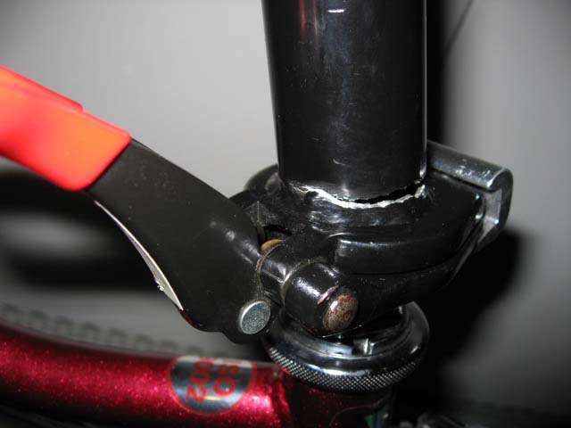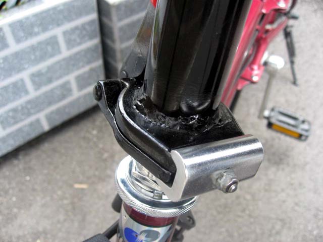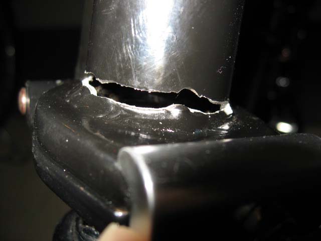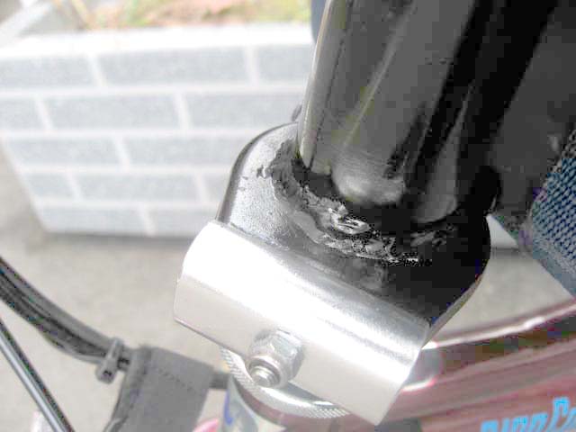 そのロックが外れたまま乗ってしまったかと思ってハンドルポスト部を見てみると、何とパイプに亀裂が入り、座金の部分から剥がれてしまっていました。