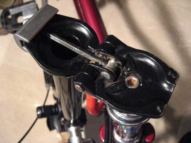 この部分を取り外すためには、まずハンドルポストを引き抜く必要があります。ハンドルポストの固定ボルトは、ハンドル折りたたみ部のこの部分にあります。6mm の六角レンチ(アーレンキー)のボルトです。