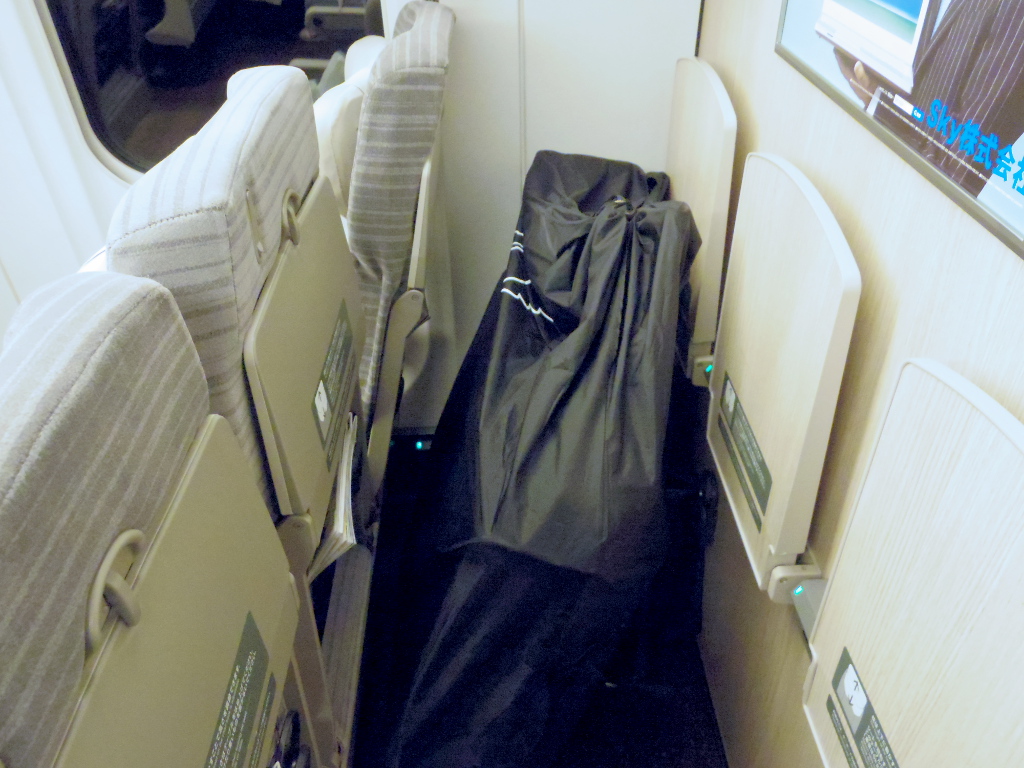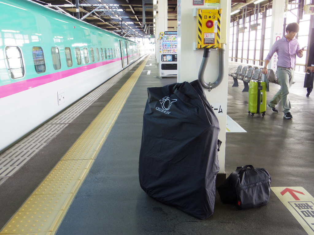 今回選択した自転車は小径折りたたみ車ではなく、ロードバイク。オーストリッチL-100/輪行袋に入れて、新幹線の車両最後尾にこのように置きました。